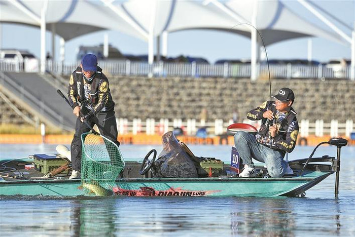 2025“西北之北”中国·北屯路亚超级联赛在十师一八三团向阳湖国际钓鱼运动基地举行。图为参赛钓手配合默契,钓到大鱼(资料图片)。赛事主办方提供