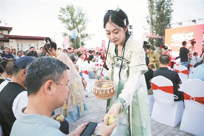 在八师一四三团九连举办的“中国蟠桃之乡”首届蟠桃大会现场,身着汉服的“蟠桃仙女”笑盈盈地把新鲜蟠桃递给观众(摄于7月26日)。兵团日报全媒体记者赵紫璇摄