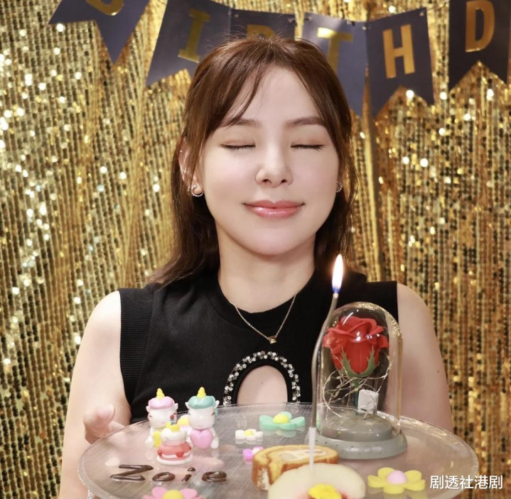 从合照中看得出,作为寿星的谭凯琪穿着修身的深色上衣,胸前的镂空设计可以说是一大亮点,虽然没有过分的打扮自己,但是看得出她也是花了心思。