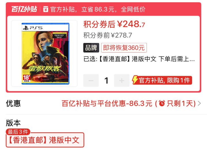 3.PS5游戏《赛博朋克2077终极版》港版中文248.7元全新包邮。