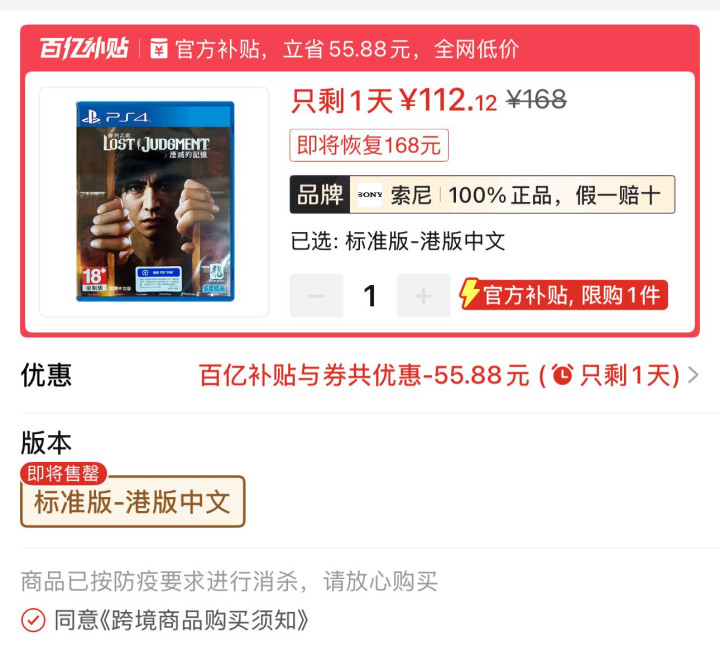 4.PS4游戏《审判之逝:湮灭的记忆》港版中文112.12元全新包邮,PS4版支持免费升级PS5版。