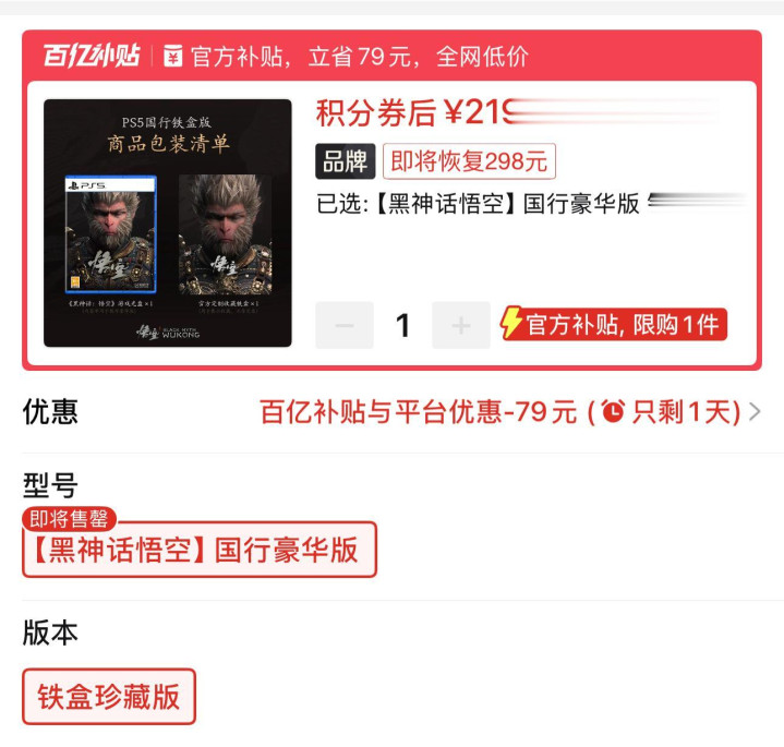 1.PS5游戏《黑神话:悟空》国行铁盒版219元全新包邮。