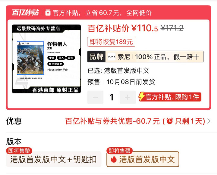 2.PS5游戏《怪物猎人:荒野》港版中文110.5元全新包邮。