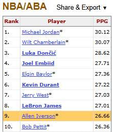 有关于得分的数据,艾弗森都在NBA历史榜上有名。