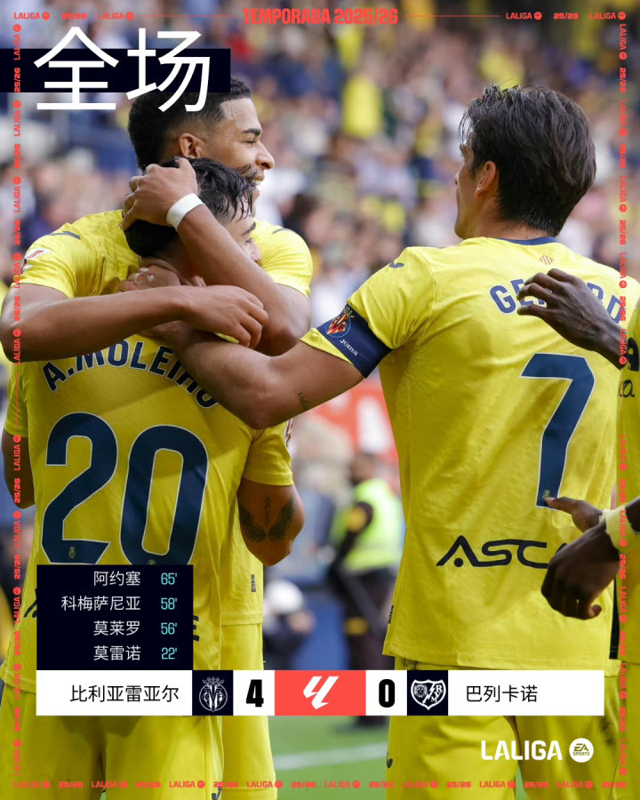 比利亚雷亚尔坐镇主场迎战巴列卡诺。比赛中,第22分钟,米卡塔泽送出助攻,赫拉德-莫雷诺破门得分,为球队取得领先。随后,第56分钟,佩德拉萨助攻莫莱罗扩大比分。仅两分钟后,莫莱罗送出妙传,科梅萨尼亚接球后破门,将优势进一步巩固。第65分钟,阿约塞-佩雷斯攻入一球,锁定胜局。最终,比利亚雷亚尔以4比0战胜巴列卡诺。黄潜本赛季主场5胜1平保持不败,跨赛季12个主场9胜3平不败。