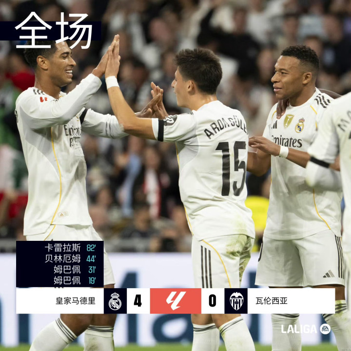皇家马德里坐镇主场迎战瓦伦西亚。上半场,银河战舰获得点球,姆巴佩一蹴而就。居莱尔助攻,姆巴佩凌空垫射再下一城。卡雷拉斯造点,不过维尼修斯主罚被扑出。巴尔韦德长传助攻,贝林厄姆兜射入死角。下半场,卡雷拉斯轰入世界波,收获个人加盟皇马的处子球。全场比赛结束,皇马4-0轻取瓦伦西亚,获得各项赛事6连胜+联赛4连胜+联赛主场6连胜,并赢得跨赛季联赛主场10连胜。