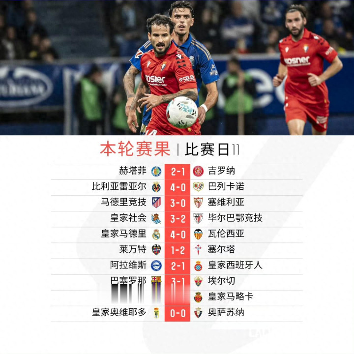 西甲联赛第11轮于北京时间11月1日至4日完赛:马里奥-马丁头球破门,马约拉尔门前包抄破门,斯图亚尼点射破门,赫塔菲2-1吉罗纳;杰拉德-莫雷诺、莫莱罗、科梅萨尼亚和阿约塞均攻入一球,比利亚雷亚尔4-0巴列卡诺;阿尔瓦雷斯点射破门。阿尔马达、格列兹曼破门,马德里竞技3-0塞维利亚;布莱斯-门德斯首开纪录,古鲁塞塔破门扳平比分,格德斯进球,纳瓦罗门前混战破门,伤停补时阶段奥亚萨瓦尔助攻戈罗恰特吉攻入制胜球,皇家社会3-2毕尔巴鄂竞技;姆巴佩梅开二度,贝林厄姆精彩世界波破门,卡雷拉斯外围爆射破门,皇家马德里4-0瓦伦西亚;亚马尔首开纪录、费尔明连场破门、费兰再下一城、拉什福德锁定胜局,巴萨主场3-1击败升班马埃尔切;安东尼两射一传,贝蒂斯主场三球大胜马略卡;十人莱万特遭塞尔塔绝杀;阿拉维斯2-1击败西班牙人;奥维耶多与奥萨苏纳互交白卷。