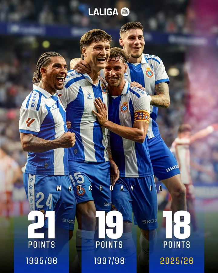 完赛十轮,西班牙人积18分,位列积分榜第5的位置 这一成绩是他们在西甲赛场上队史第三佳的赛季开局