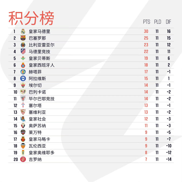 积分榜方面,皇马5分领跑,巴萨紧随其后,黄潜、马竞、贝蒂斯分列三四五。瓦伦西亚、奥维耶多和吉罗纳深陷降级区。
