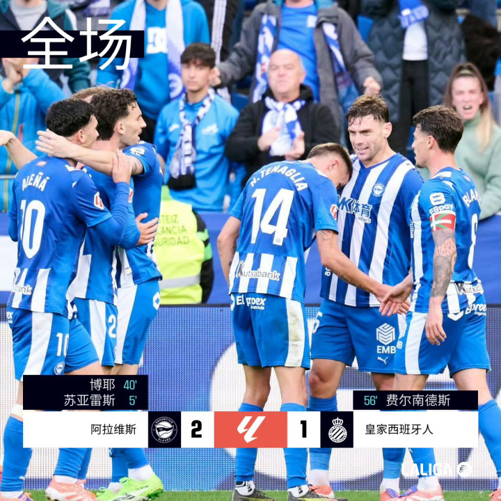 阿拉维斯坐镇主场迎战西班牙人。比赛开局阶段,第5分钟,阿拉维斯率先打破僵局,德尼斯-苏亚雷斯成功破门,为主队取得领先。随后在上半场临近结束前,第40分钟,卢卡斯-博耶再下一城,进一步扩大比分优势。易边再战,西班牙人展开反击,第56分钟,罗伯托-费尔南德斯在队友助攻下扳回一球,为客队缩小差距。比赛进入尾声阶段,卢卡斯-博耶因累计两张黄牌被罚离场。最终全场比赛结束,阿拉维斯以2比1战胜西班牙人,全取三分。