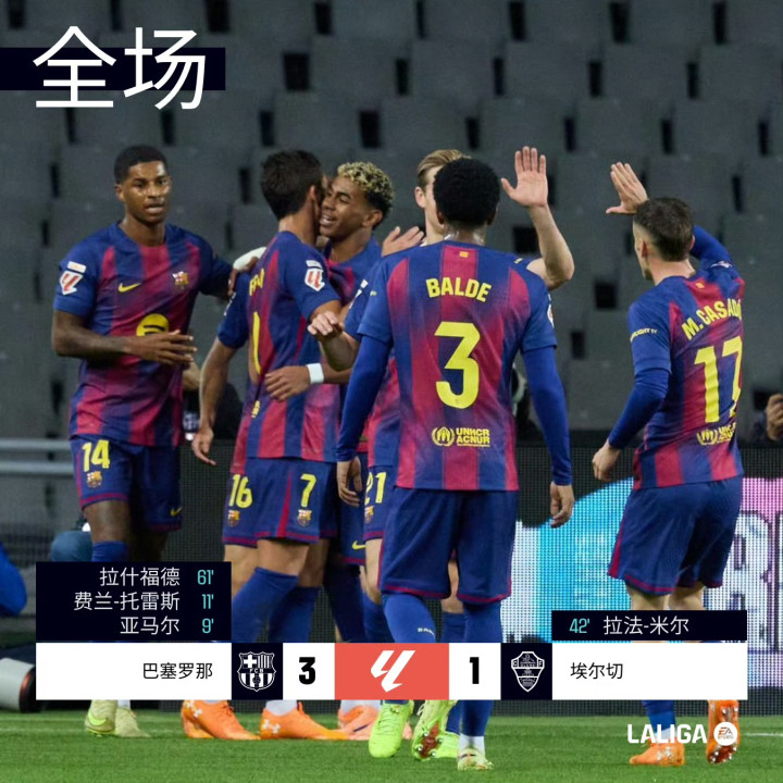 巴塞罗那坐镇主场迎战埃尔切,本场主裁判为米格尔-塞斯马。上半场第9分钟和第11分钟,亚马尔与费兰三分钟内接连破门,第42分钟,拉法-米尔为埃尔切扳回一城。下半场第61分钟,拉什福德爆射破门,随后,拉法-米尔两度中框。最终,巴萨主场3-1击败埃尔切。巴萨豪取主场5连胜,埃尔切则遭遇客场3连败。