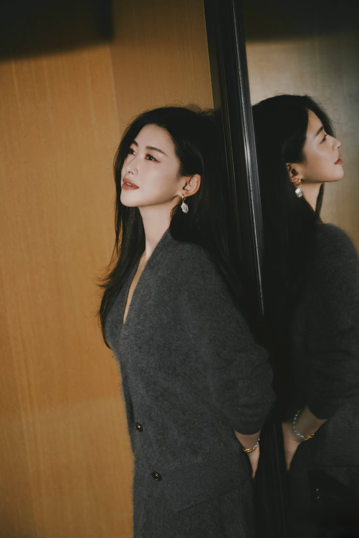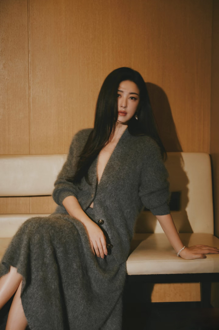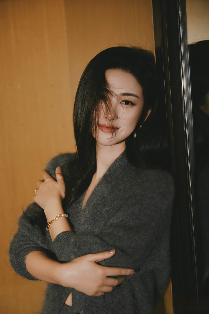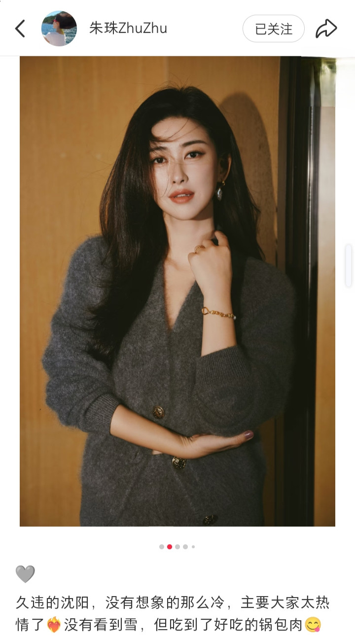 朱珠晒新照, 灰毛绒套装配长卷发, 气质优雅好惊艳