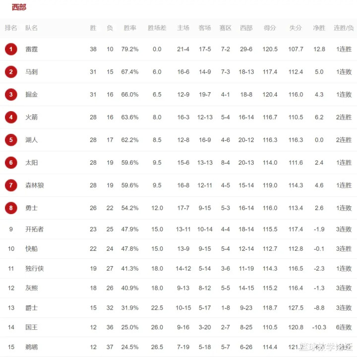 目前火箭28胜16负依然排名西部第四,落后第三的掘金1.5个胜场,领先第五的湖人0.5个胜场。西部第2-7名依然存在很大变数,第二的马刺领先第七的森林狼只不过3.5个胜场。可能常规赛最后一场打完了,这几队的排名才能确定!