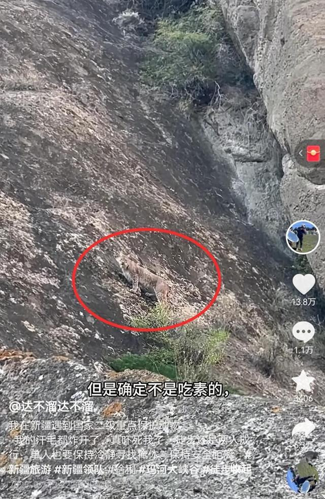 有游客日前发视频称,他在新疆玛河大峡谷一个人徒步时,遇到国家二级保护动物猞猁,“汗毛都炸开了,真吓死我了!”。