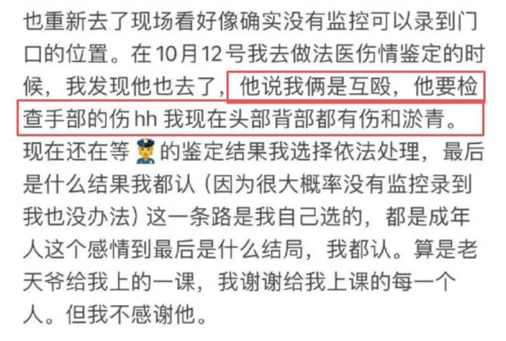 两人约见面沟通,结果就有了殴打女生的事,致女方头部、肩部受伤。荣梓杉见女方报警立案后又秒怂,卖惨求和无果后试图将女方控告的殴打模糊成互殴,搅浑水。