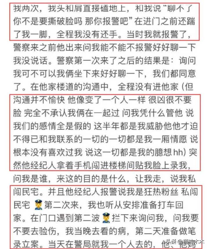 其三,荣梓杉承认出轨后一个星期又反悔了,冲到女方家发疯,自导自演录音“没谈恋爱”,拿经纪公司威胁女方及亲属,发现硬的不行后又调整策略,采用柔化策略哄骗女方原谅,女方看他低声下气认怂后决定和好。而这之后的半年里双方没见面,荣梓杉拿着生病、读书、进组等借口推托见面,一见面荣梓杉又承认出轨一个上戏女生,还试图拿童星挡枪,最终矛盾爆发。