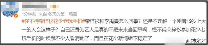 荣梓杉出轨打人一事被曝光后,其过往许多言行也被翻出,其中比较著名的是《花少》片段,不少网友吐槽他终于翻车了,也感慨他怪不得录制节目老玩手机,原来是真忙。但还是不能理解一个19岁的大学生为何会有这么烂的感情观,童星出身的他又为何如此不爱惜自己的职业生涯。