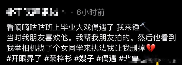 巧的是李禹熹的爆料有吃瓜群众补充证据,她称荣梓杉在去年12月21日陪同其中一个暧昧对象在北电看戏,有网友晒了现场同框照,还吐槽荣梓杉现场很警惕,看到有人拍找人执法删掉,脸色还臭到像要打人。