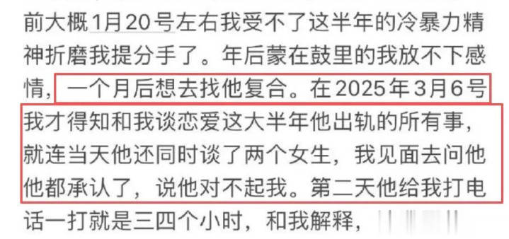 其二是女方调查核实查明男方出轨详情,发现男方与至少三个女生存有暧昧关系,不限于发现男方脖子上有草莓印等证据,查岗被糊弄,还被单方面删除联系方式,女方忍无可忍主动提分手。时隔一个月女方反悔又主动提复合,彻底明了荣梓杉劈腿实情,男方承认与她恋爱期间还谈了另外两个女朋友,并向女方道歉认错求和。